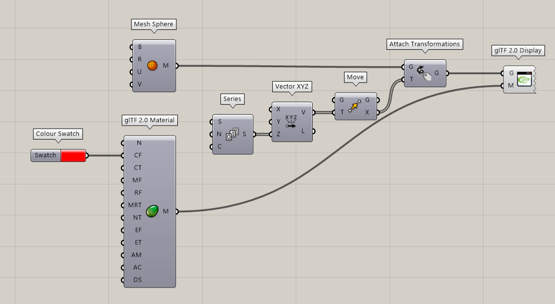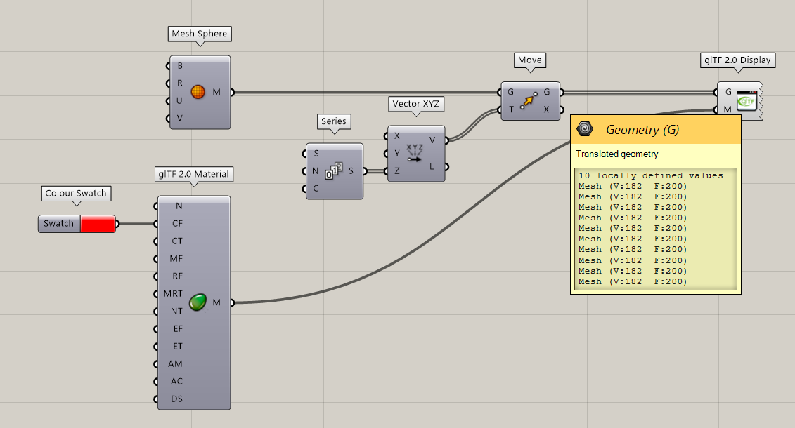 The same sphere is translated and copied multiple times. All 10 instances of the mesh are sent to the glTF 2.0 Display component, which will store all of them in the solution that will be transferred through the servers.