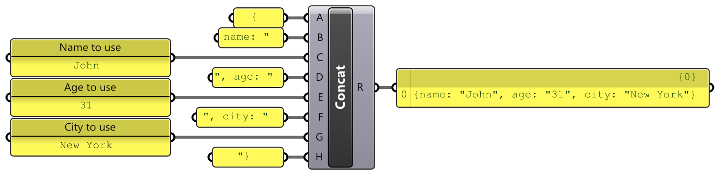 In order to build and export this JSON, we can use the Concatenate standard Grasshopper component which concatenates pieces of text together. The example above can be obtained with a simple definition: