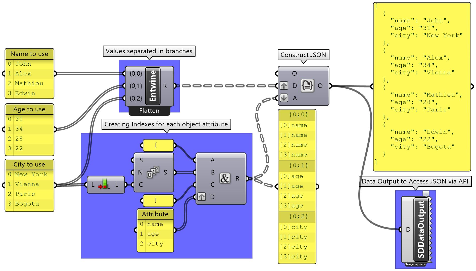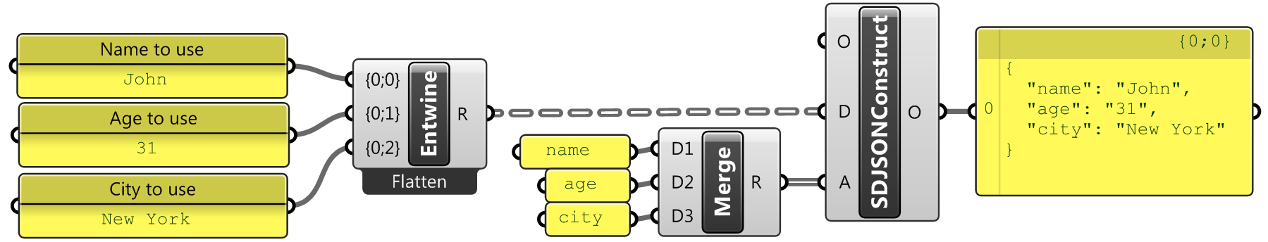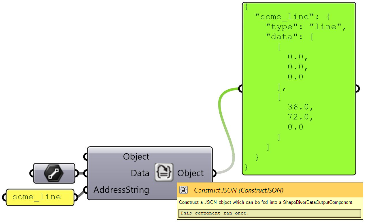 The Construct JSON component simplifies the process of putting together a string of characters representing an object. It also converts Grasshopper data types into JSON format doing basically the opposite of the ShapeDiverJSONConvert component.