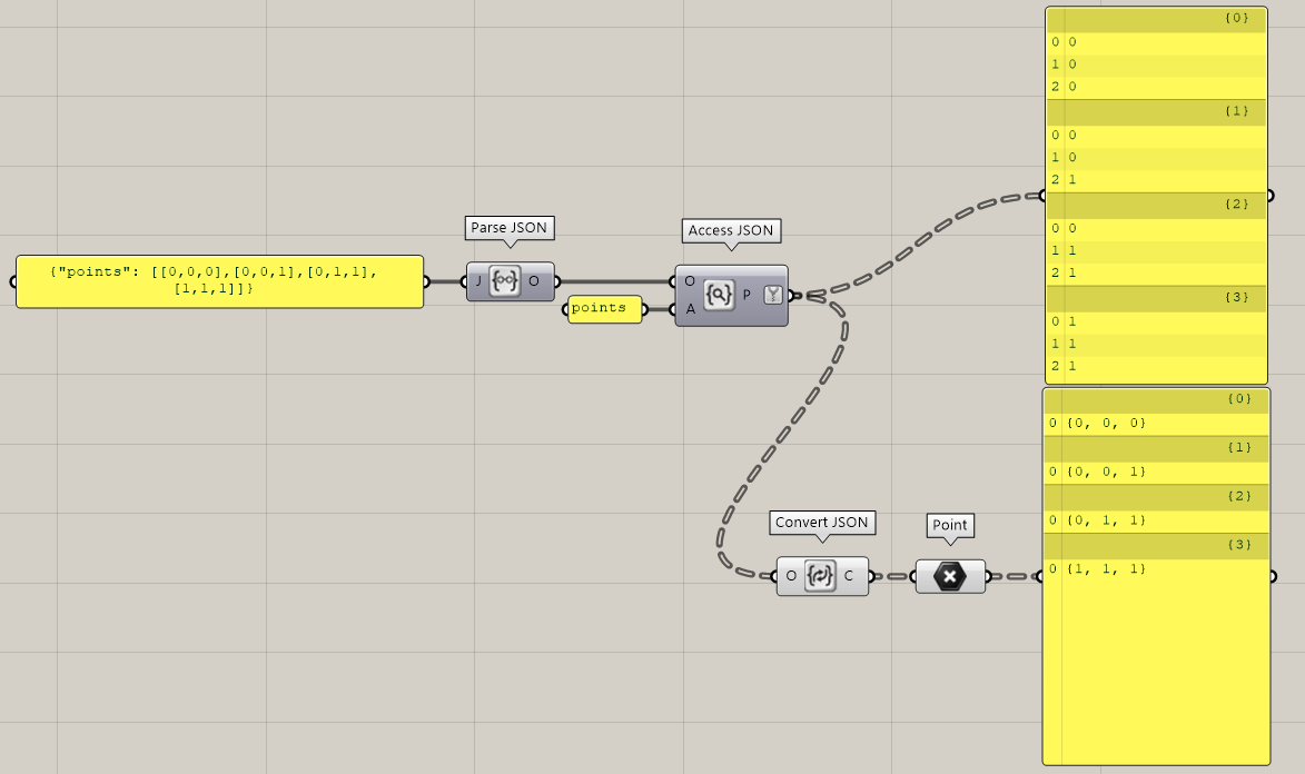 The Convert JSON component converts your parsed JSON objects into common Grasshopper data types. The most basic conversion is by giving an array of 3 numbers that are then turned into points: