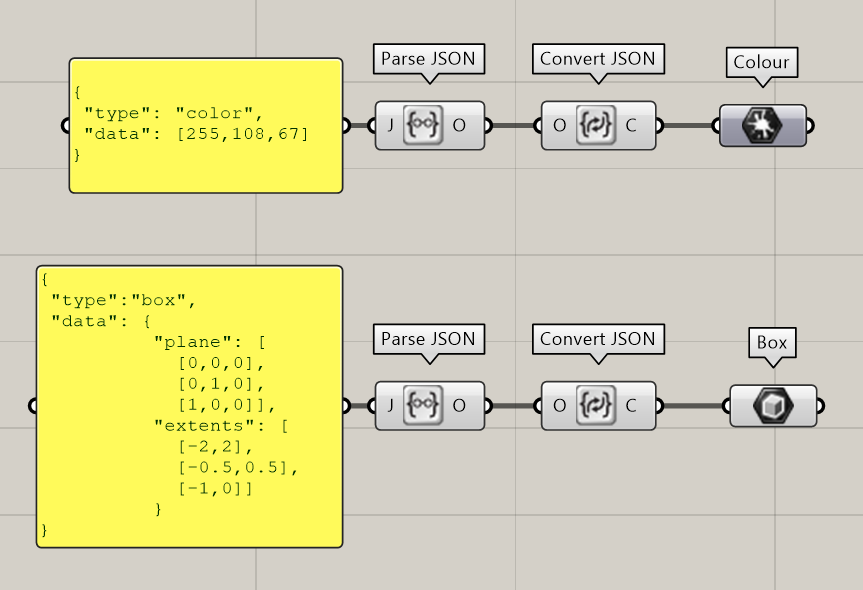 However, you can send more complex JSON structures to create colors, boxes, nurbs surfaces, nurbs curves, transformations and more. The JSON has to be organised by providing a “type” attribute and a “data” attribute. For example, in order to create a color we will call our “type”:“color” and the “data” will contain an array of 3 numbers which represent the Red, Green and Blue values. A box needs a plane with origin, X axis and Y axis and an array with three domains defining the size for each axis.