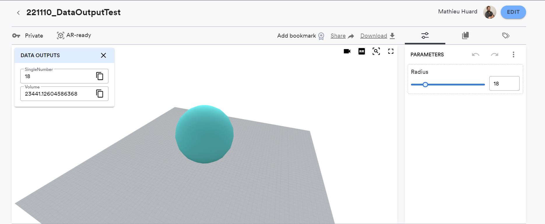 The ShapeDiver viewer canvas includes a data output visualizer, that can be accessed from the button on the top left of the viewer canvas: