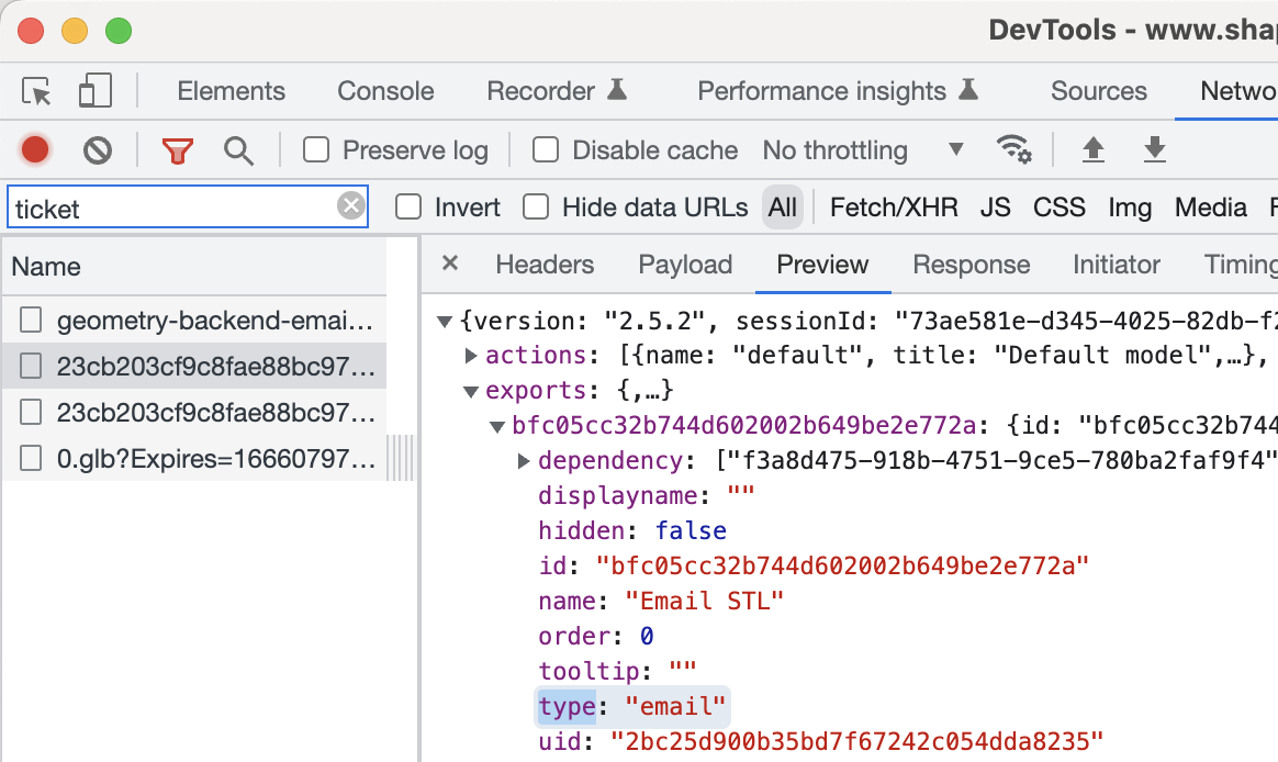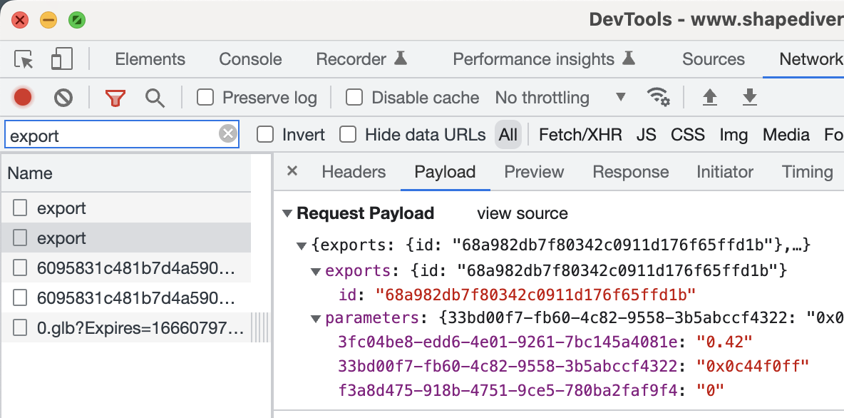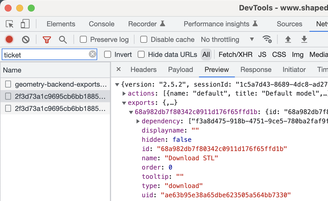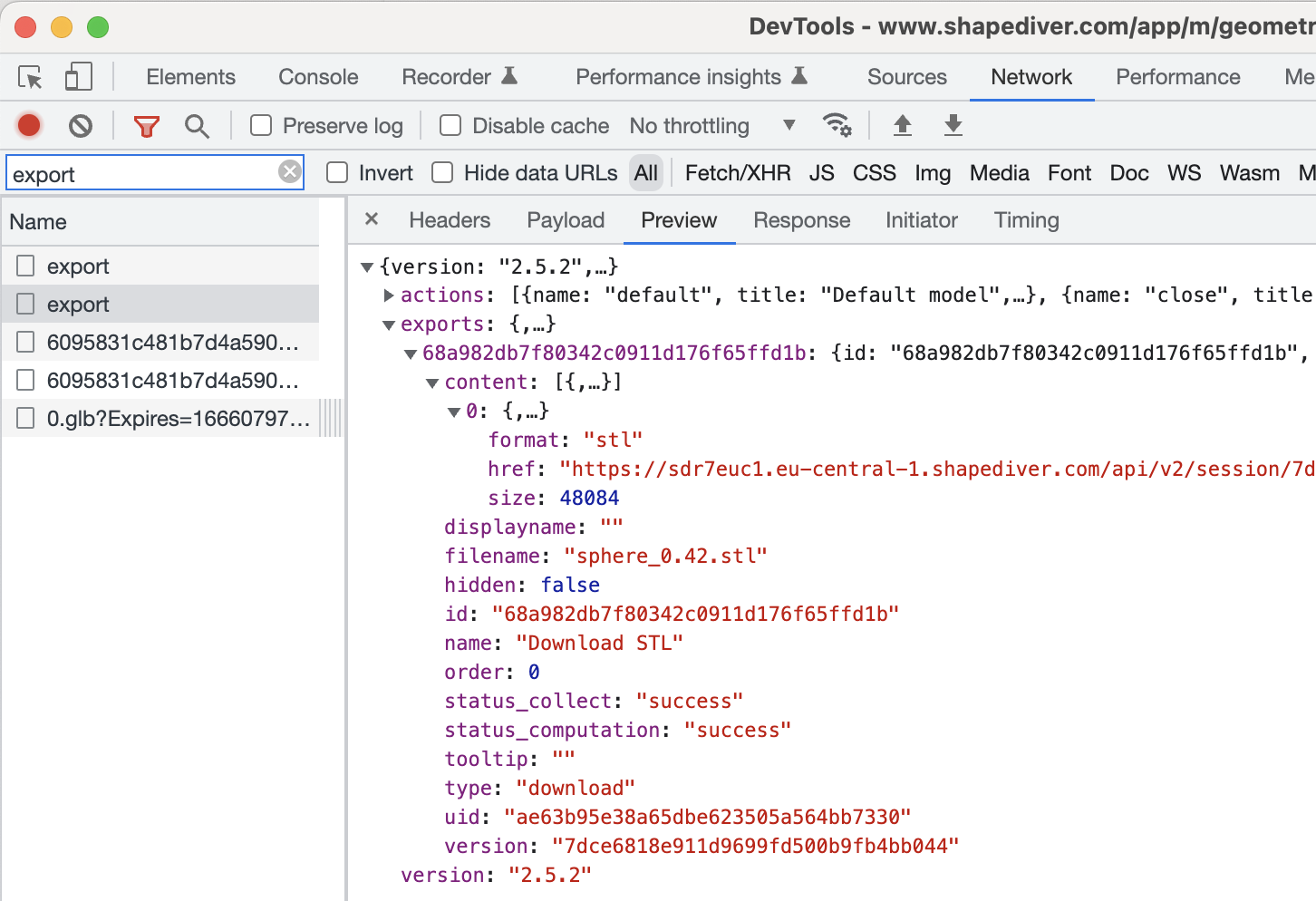 The request payload shows the id of the requested export (the id 68a982db7f80342c0911d176f65ffd1b of the export named “Download STL“ of our example model), and it also contains the parameter values for which the export is requested. The response to this export request now also contains the dynamic properties of the export: