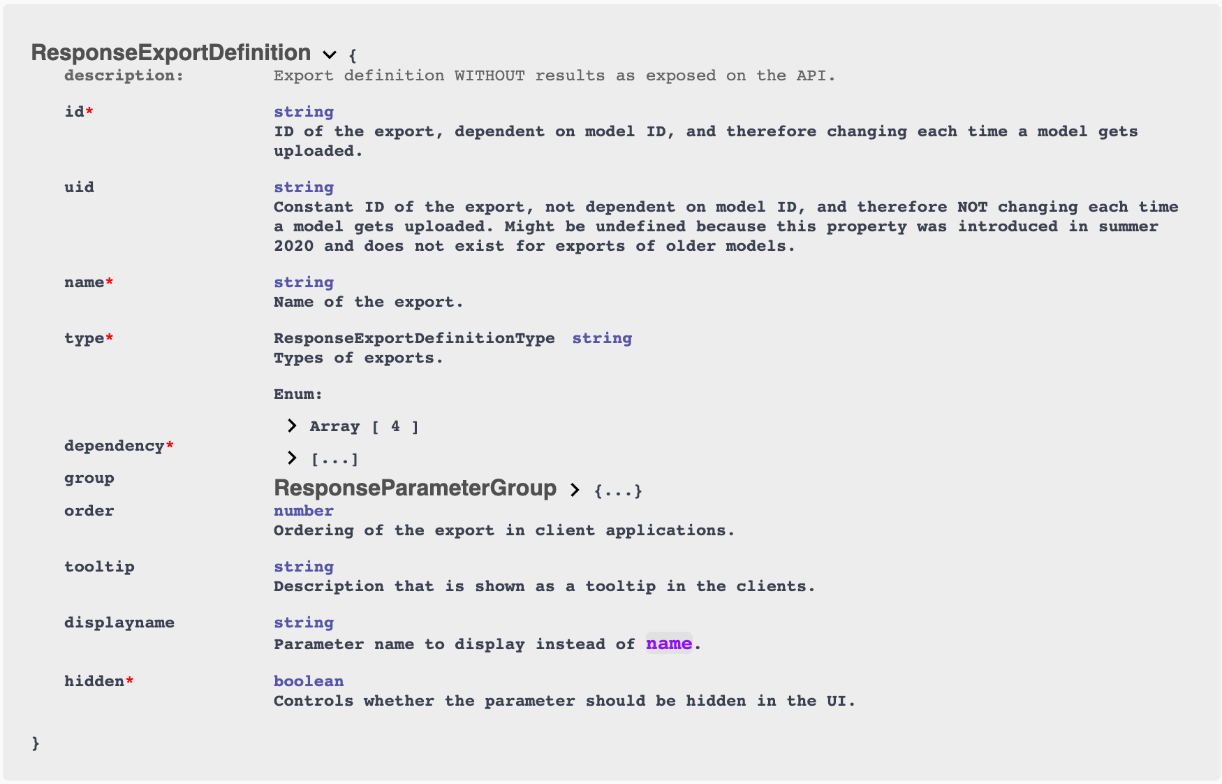 For each export the API exposes some static properties, which do not depend on a computation result of the model. These static properties uniquely define the export (like name and id).