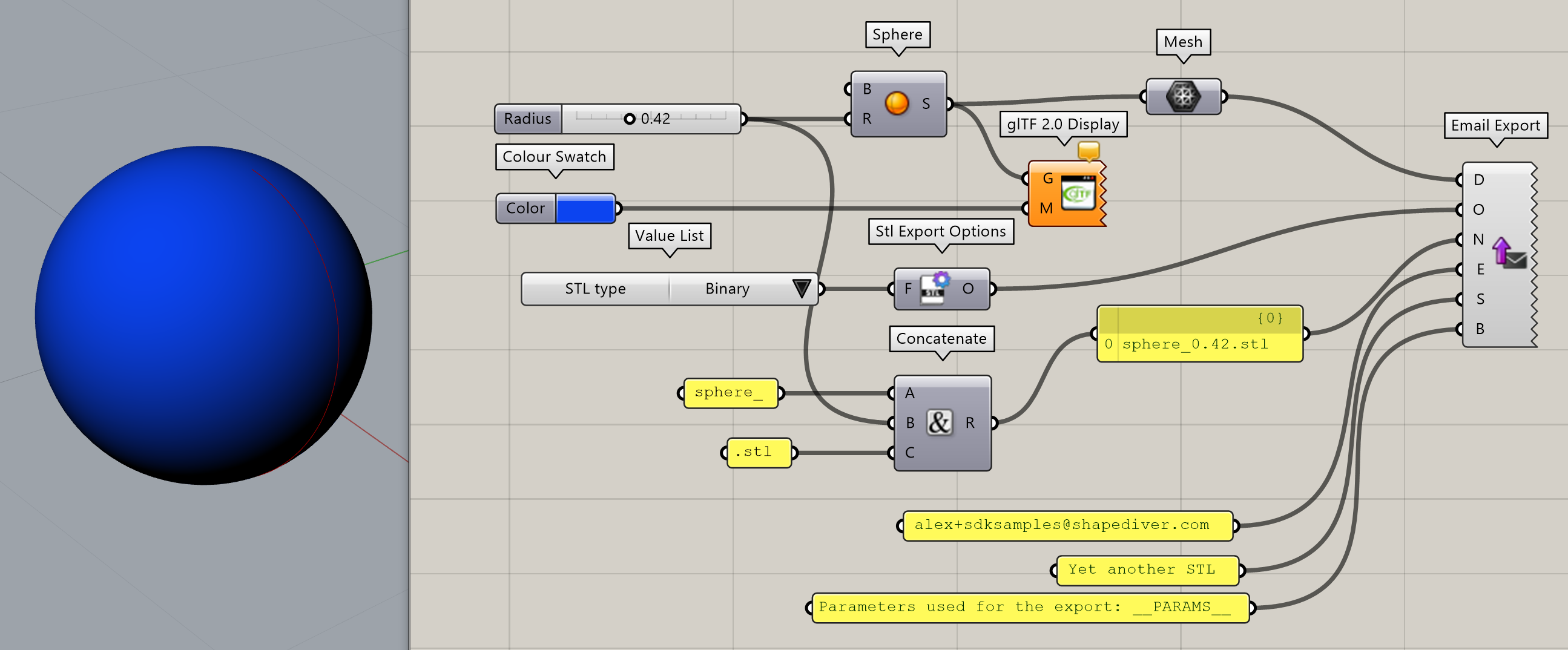 The following sections provide an overview on how to define exports using the ShapeDiver plugin for Grasshopper: Download Export, Email Export