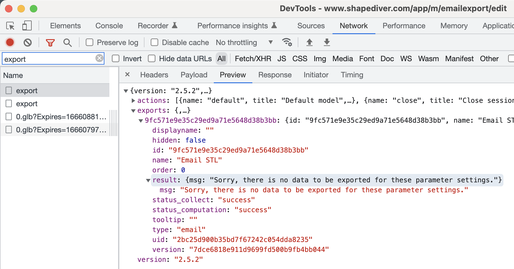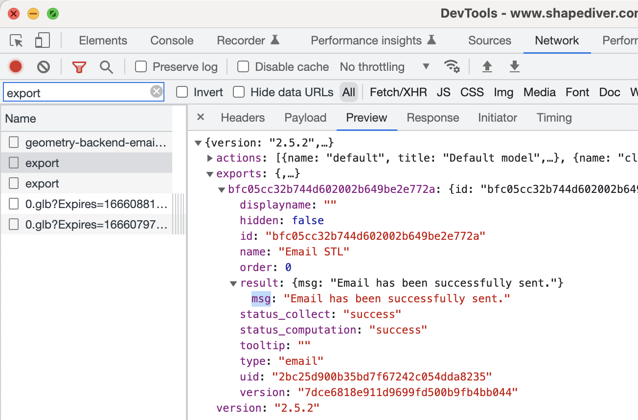 The computation of an export is requested using an export request. You can easily inspect this in the console of your browser by filtering network requests for the keyword “export”. An example, taken from the model shown above: