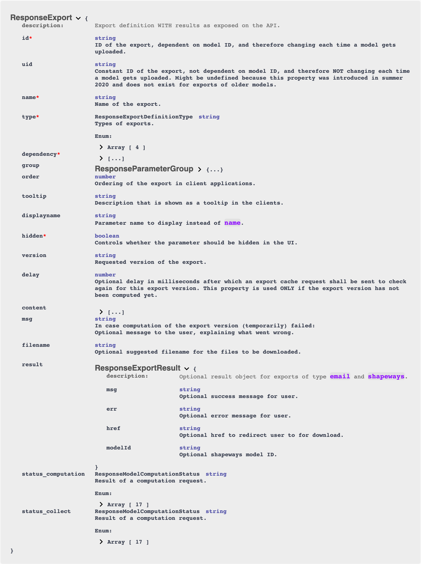 The API also exposes dynamic properties for each export, which contain computation results and related data. The dynamic properties are only included in reply to an export request.