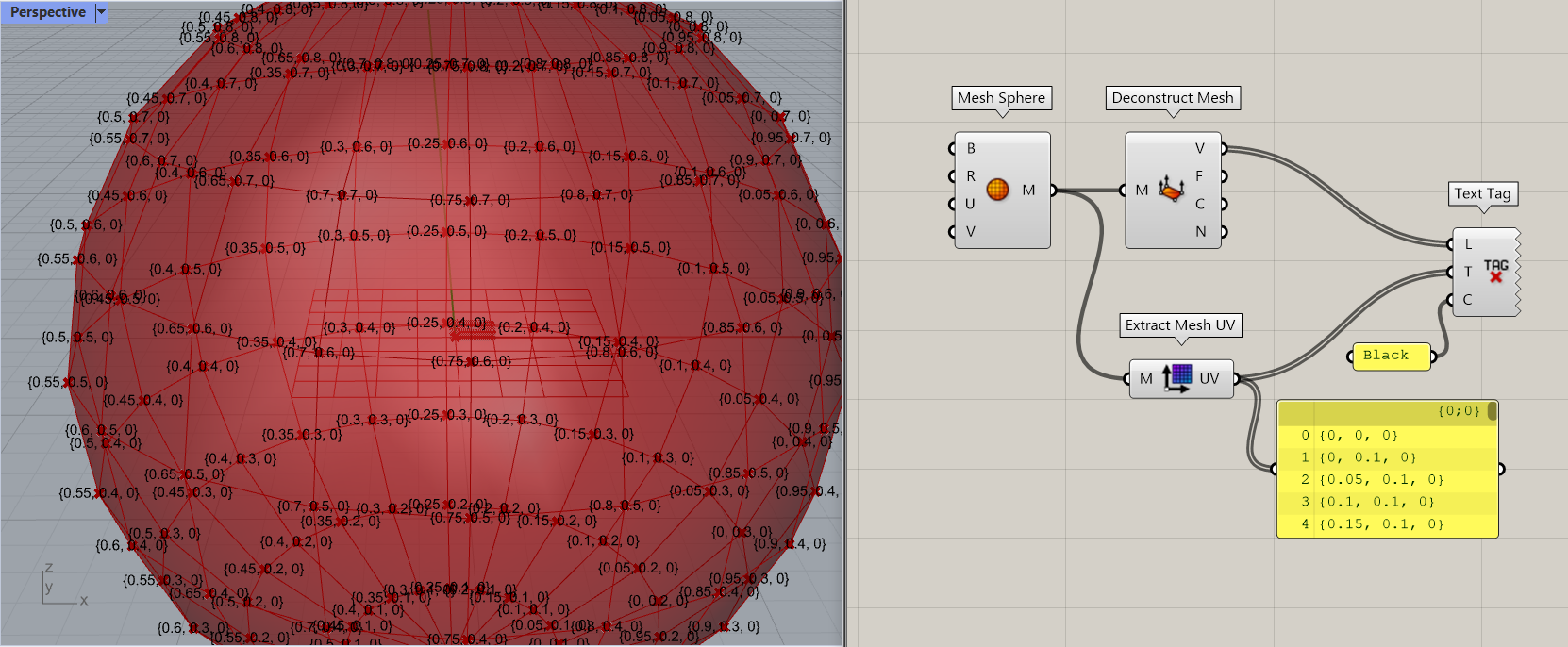 Use the Extract Mesh UV component in order to extract the list of texture coordinates associated with each vertex of a mesh. The output is a list of Points {X,Y,Z} whose the two first coordinates (X and Y) contain the value of the texture coordinate of the vertex. The order of coordinates in the list corresponds to the order of the various list outputs of the Deconstruct Mesh component, therefore it is convenient to match each vertex with its coordinate. In the following example, we construct a text tag showing the value of the coordinate for each vertex of a sphere mesh: