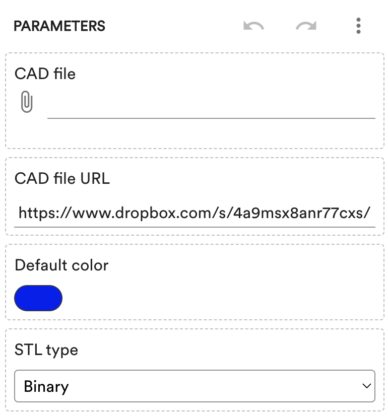 The “CAD file” parameter corresponds to the Import Geometry component, while the “CAD file URL” parameter is defined by the Direct Text Input component. A public URL can be set for the “CAD file URL” parameter, which the Import Geometry component downloads and imports a file from, in case no file has been uploaded to the “CAD file” parameter yet. This is why the model shows a bunny by default.
