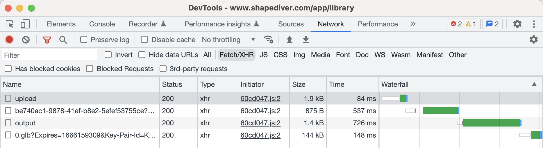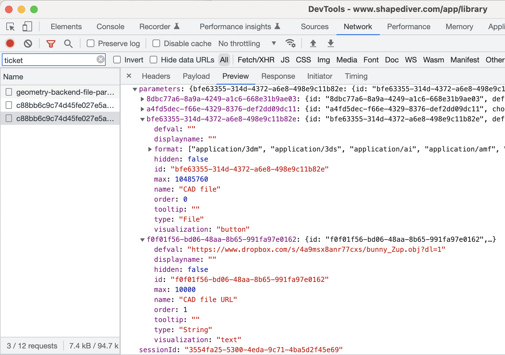 When inspecting the model on the browser console, the session init response shows the following parameters to represent the “CAD file” and the “CAD file URL” parameters: