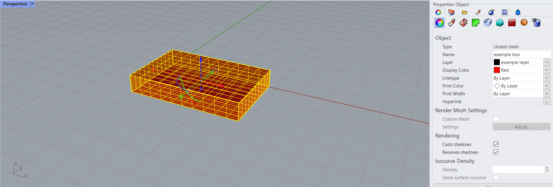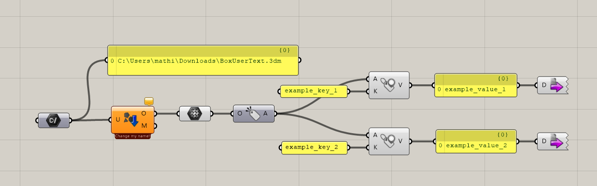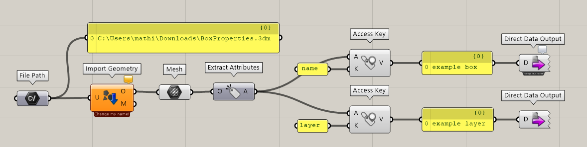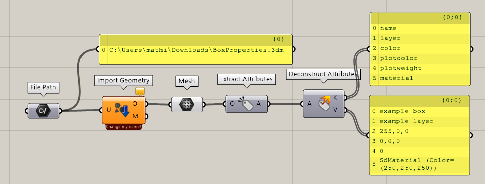 It has a defined name (“example box”), layer (“example layer”) and color (“Red”). When saving it to a 3dm file (or any other file format which support the concepts of names, layers and object colors) and then using the Import Geometry component to import it in Grasshopper, those three properties can be extracted from the imported object using the attribute components. This can be tested locally be referencing the local 3dm file: