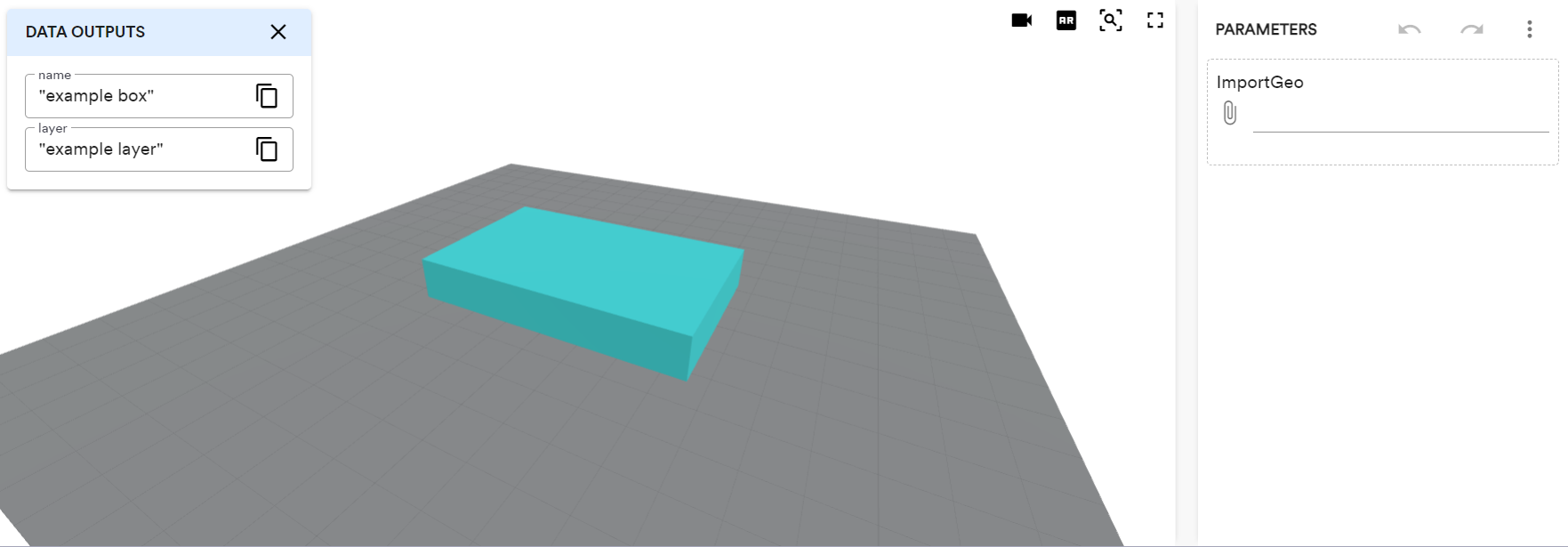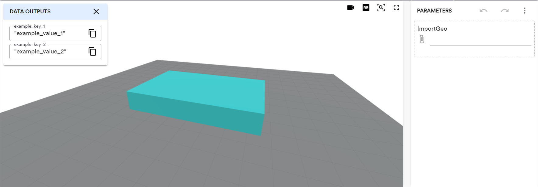 Once uploaded, the ShapeDiver model contains a file input. Any user can then upload their own 3dm file. When the file containing the box is selected as input, one can verify that the data outputs show the corresponding attribute values: