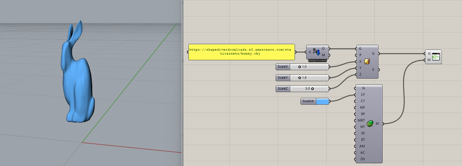 The URI input of the Import Geometry component is fed the static URL of a remotely stored, publicly accessible obj file (https://shapediverdownloads.s3.amazonaws.com/staticassets/bunny.obj). By default, the component outputs the geometry included in this file before users of the online model upload their own.
