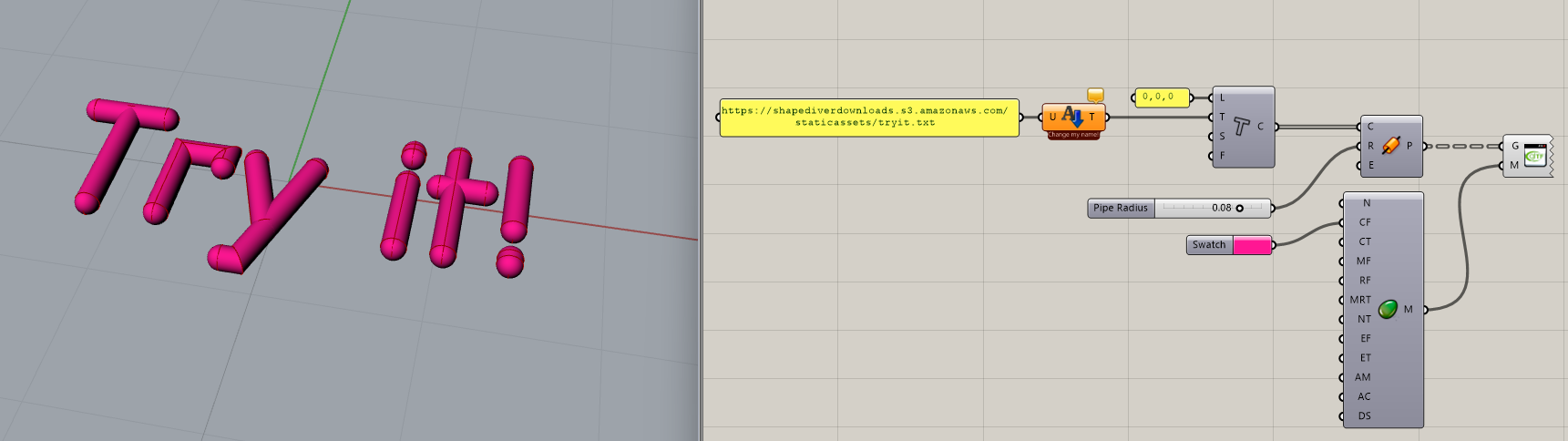 The URI input of the Import Text component is fed the static URL of a remotely stored, publicly accessible obj file (https://shapediverdownloads.s3.amazonaws.com/staticassets/tryit.txt). By default, the component outputs the text included in this file before users of the online model upload their own.