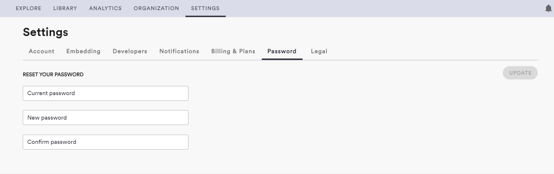 If you are logged in your ShapeDiver account, you can update your password directly from the settings section. Go to “Settings” and find the “Password” tab. Don’t forget to click on “Update” to apply the change after completing the required fields.