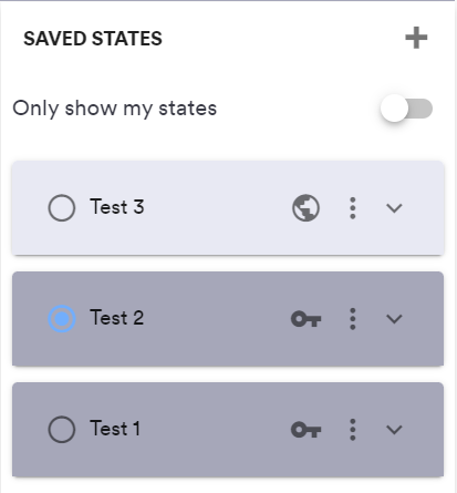 You can easily navigate between saved states and load a new one by clicking on the radio button on the left of the element in the list. The active state is shown with an active radio button: