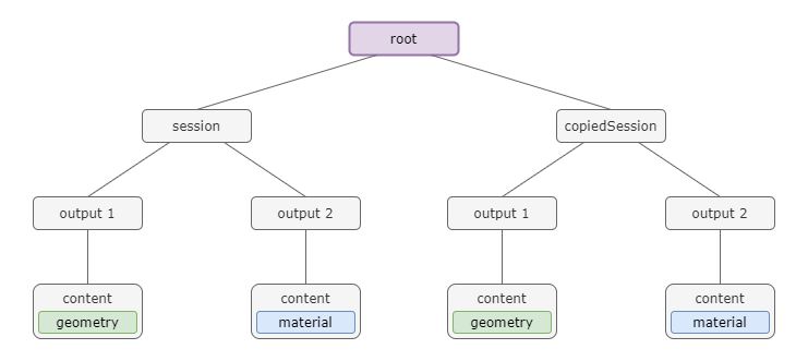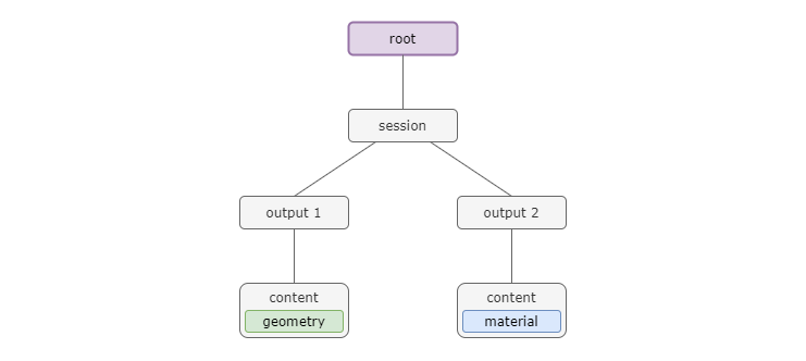 Before we do anything, the scene tree has already been created. There is nothing in it besides the root node. So let's just look at how the scene tree looks after we create a single session. Our scene tree now change as a node was added automatically. Let's assume, the session has two outputs with one content each. Then the scene tree will look like this: