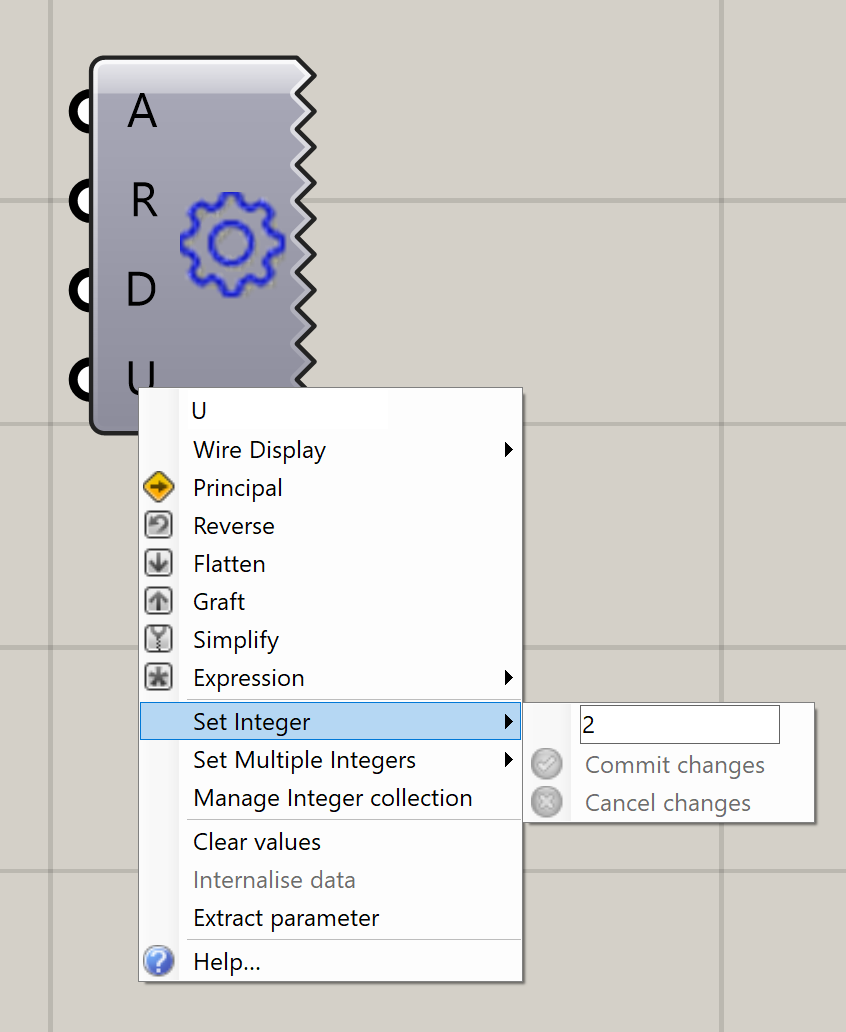 It is important to set the numbers for the inputs of this component directly on the component's inputs by right clicking on them and choosing Set Number or Set Integer. Do not connect any other components to the inputs.
