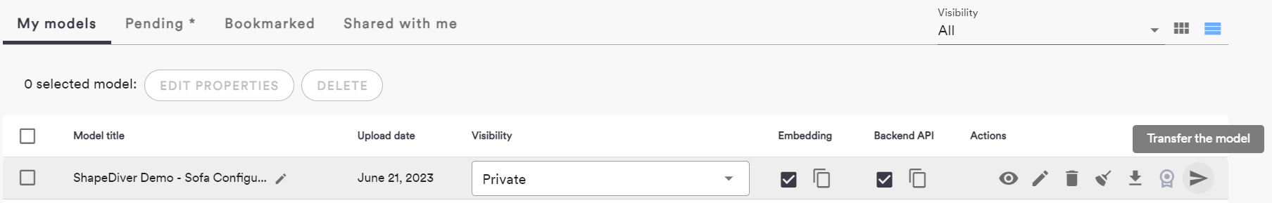 The “Transfer” option allows you to transfer the ownership of one of your models to another ShapeDiver user. Find it in the context menu of the model card in the library or the list of actions in the table view:
