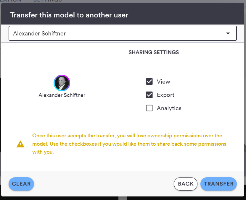 Once a user accepts your transfer request, you will lose ownership permissions over the model. In case you still want to retain some permissions over the model, you can ask the target user that they share back some of the model capabilities. At the moment, three options are available: