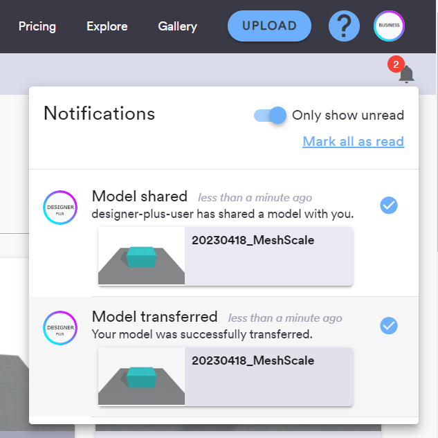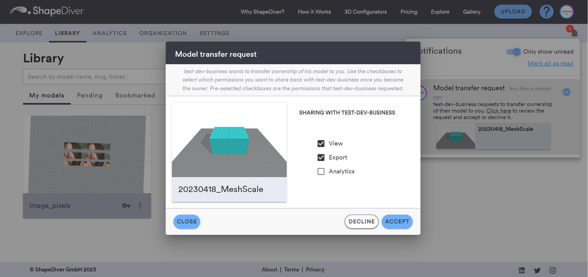 The target user is notified about the permissions you would like to receive back after the model transfer. They will have the option to accept your requests or deny them individually before accepting the transfer. In case some permissions are shared back with you, you will also receive a notification about those: