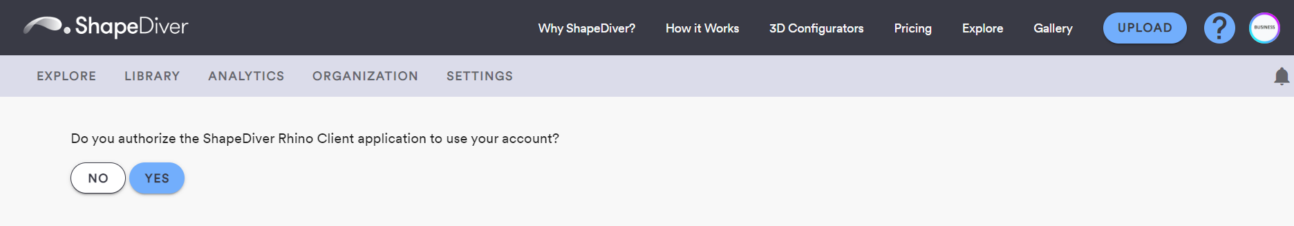 Launching the ShapeDiver command and clicking Log In in the top-level menu of Grasshopper will both trigger opening the authentication page of the ShapeDiver platform in a web browser. If you are not logged in from the web browser yet, you will need to do that first before getting redirected to the authentication page. There, just click “Yes” to finalize the authentication.